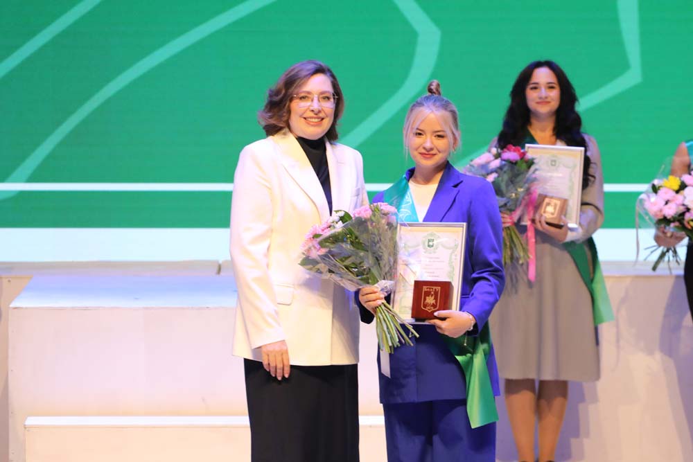 Ректор Евгения Карловская во время торжественного мероприятия вручила памятные награды выпускницам Старооскольского филиала НИУ «БелГУ» Дарье Базаровой, медицинского института Елизавете Боевой, института межкультурной коммуникации и международных отношений Ксении Буниной, юридического института Владе Кобзевой, института наук о Земле Елизавете Палтышевой, педагогического института Софье Тихомировой, института инженерных и цифровых технологий Анне Шайковой, а также выпускникам института общественных наук и массовых коммуникаций Павлу Головину, института экономики и управления Артёму Лисицкому и института фармации, химии и биологии Игорю Тарасову.