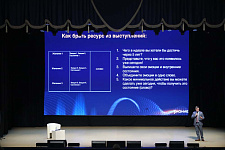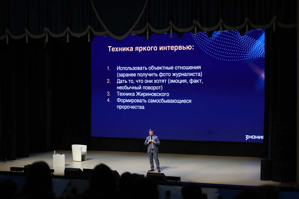 В ходе мастер-класса спикер продемонстрировал презентацию, включающую несколько техник работы с собственным сознанием и эмоциями, приёмов самоконтроля и выступления перед камерой. Слушатели смогли принять участие в практиках и самостоятельно опробовать некоторые приёмы. Как пояснил спикер, эффективность упражнений зависит от регулярности их исполнения – чем упорнее и чаще занимается человек, тем проще даётся каждый следующий выход на сцену или к микрофону.