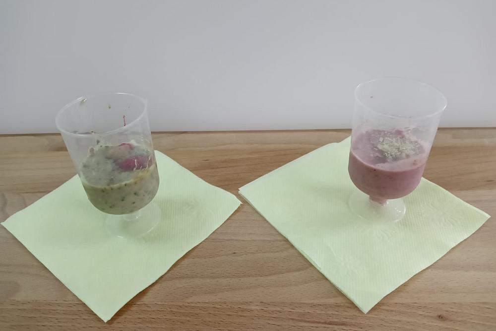 Молодые люди приготовили вкусный густой напиток смузи с такими незабываемыми вкусами, как льняная вишня, кешью-смородина, зелёный, яркий тыквенный, двойной шпинат и очень шоколадный.