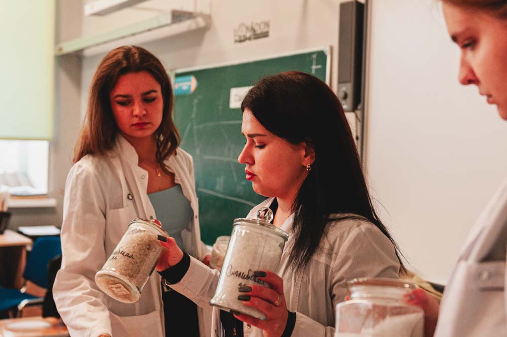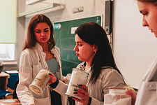 Ассистент кафедры биохимии Галина Шайдорова и студентки ИФХиБ Анастасия Гаркавая и Арина Андреевская провели мастер-класс «Ароматерапия» по изготовлению натуральной морской соли для ванн с использованием эфирных масел.