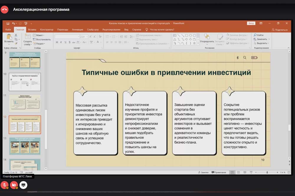 – Участие в грантовых конкурсах, акселераторах или просто выступление перед инвесторами требует тщательной подготовки и репетиций. Проработайте сценарий своей презентации, выпишите все цифры – они могут понадобиться, если вам зададут какой-то вопрос, касающийся конкретики. Не лишним будет пройти курс ораторского и актёрского мастерства, – поделилась эксперт.
