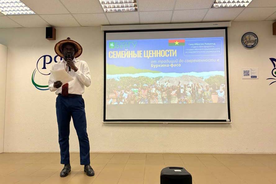Студент института межкультурной коммуникации и международных отношений Сану Ибрагим Ромуальд под руководством начальника отдела сотрудничества с приоритетными регионами мира, доцента кафедры русского языка, профессионально-речевой и межкультурной коммуникации Раисы Кулешовой представил наш университет в Институте русского языка Российского университета дружбы народов имени Патриса Лумумбы (РУДН) на II Международном фестивале для иностранной студенческой молодёжи России «Семейные ценности разных народов мира: от традиций к современности». Ибрагим выступил с докладом «Семейные ценности Буркина-Фасо: от традиций до современности», подготовленным в качестве зачетной работы по дисциплине «Практикум по культуре профессионально-речевого общения» на русском языке.