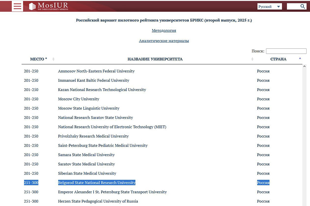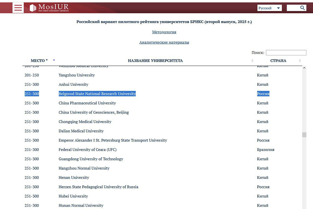 НИУ «БелГУ» сохранил присутствие в рейтинге университетов стран БРИКС