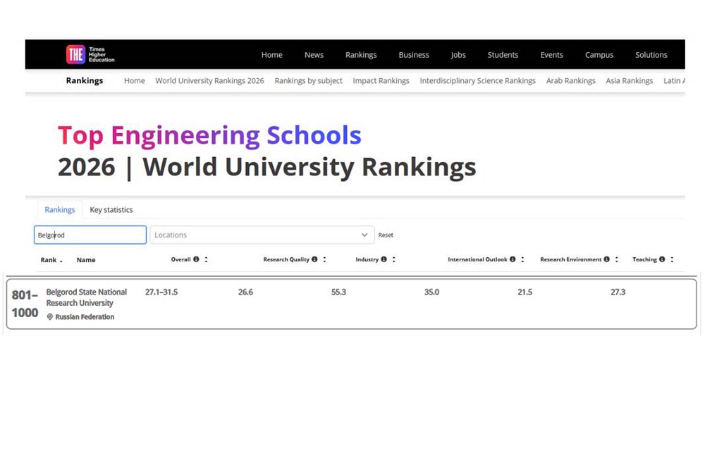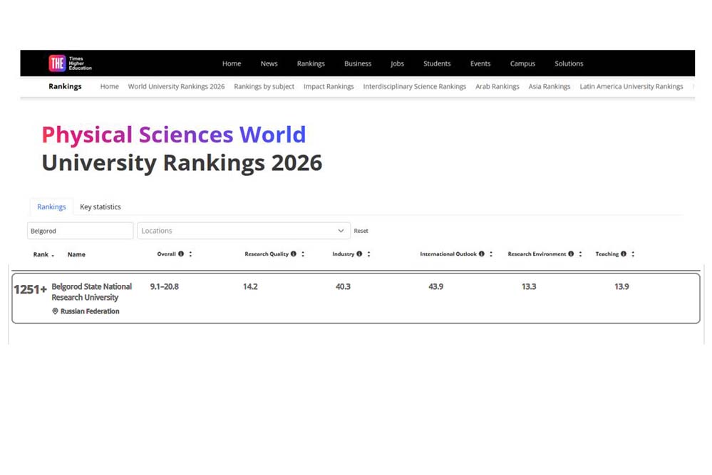Международное агентство Times Higher Education опубликовало 11 предметных рейтингов, в пяти из которых представлен Белгородский государственный национальный исследовательский университет. Как прокомментировала специалист отдела мониторинга и аналитики реализации программ развития НИУ «БелГУ» Олеся Серкина, наш университет присутствует в предметных рейтингах Times Higher Education с 2019 года: сначала по двум предметам – Физические и Инженерные науки, с 2024 года – по четырём: к первым двум добавились Медицинские и Педагогические науки, а с 2026-го – по пяти предметам, в т.ч. по Наукам о жизни.