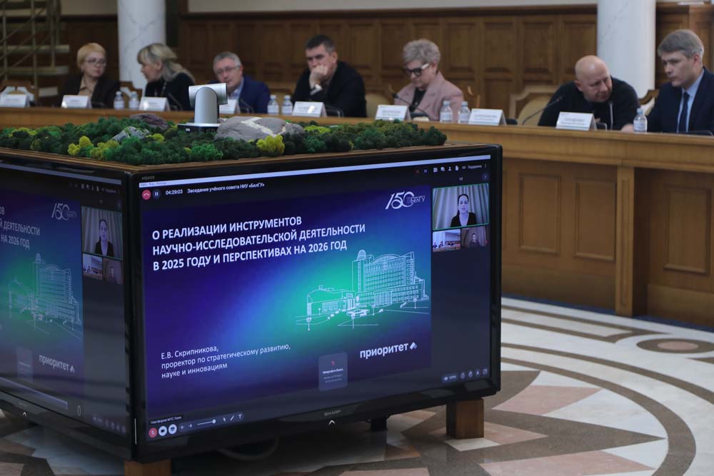 Члены учёного совета рассмотрели вопрос использования инструментов научно-исследовательской деятельности в 2025 году и перспективы внедрения эффективных инструментов на 2026 год. Доклад представила проректор по стратегическому развитию, науке и инновациям Елена Скрипникова. Проректор отметила, что в прошедшем году научно-исследовательская деятельность вуза реализовывалась в контексте федеральных и региональных стратегических приоритетов, с учётом положений федеральных нормативных актов, национальных проектов и программ технологического суверенитета.